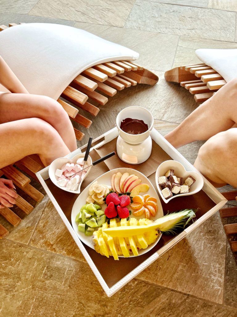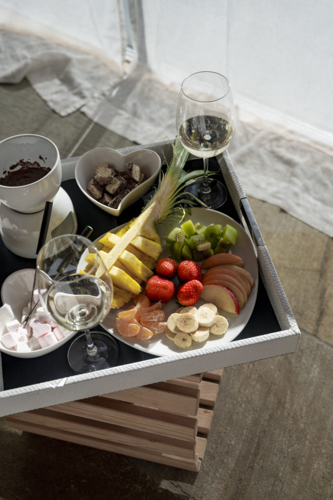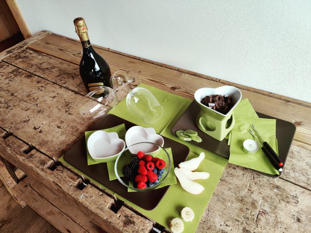 Fonduta di cioccolato e frutta fresca di stagione accompagnata da una spumeggiante bollicina!